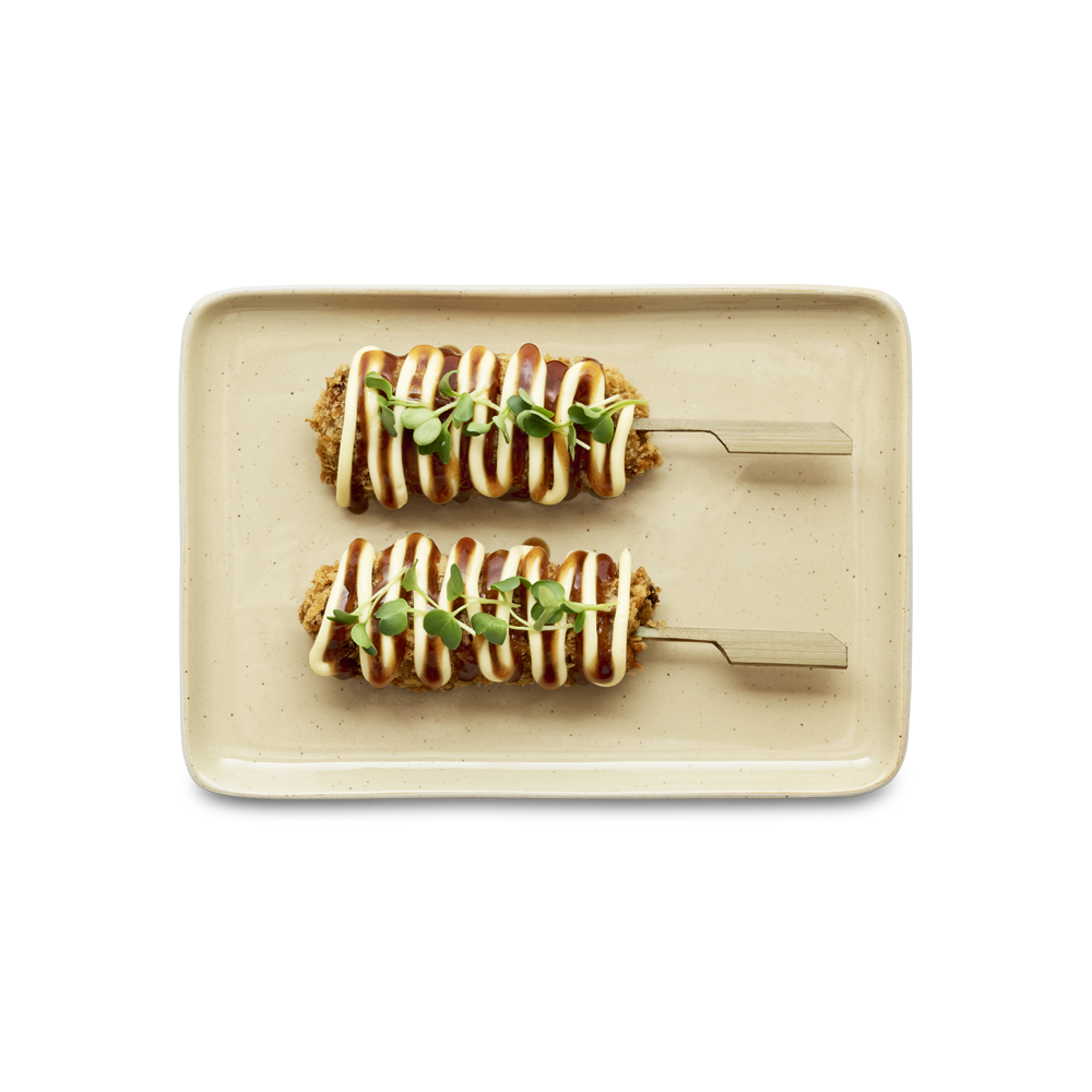 Beef fillet, panko, okonomiyaki sauce, Japanese mayonnaise, daikon cress